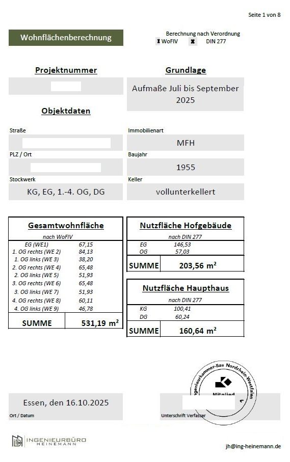 Die Wohnflächen- und Kubaturberechnungen erfolgen detailliert und raumweise auf Grundlage des exakten Aufmaßes. Die Wohnfläche wird strikt nach der Wohnflächenverordnung ermittelt, während Flächen und Kubaturen ergänzend nach DIN 277 berechnet werden. Jeder Raum wird einzeln angesetzt, Besonderheiten wie Dachschrägen, unterschiedliche Raumhöhen, Balkone oder Nebenflächen werden normgerecht bewertet und rechnerisch hergeleitet. Alle Berechnungen enthalten vollständige Rechenwege und sind damit klar nachvollziehbar und prüfbar. So entstehen belastbare Unterlagen, die weit über einfache Flächenaufstellungen hinausgehen.